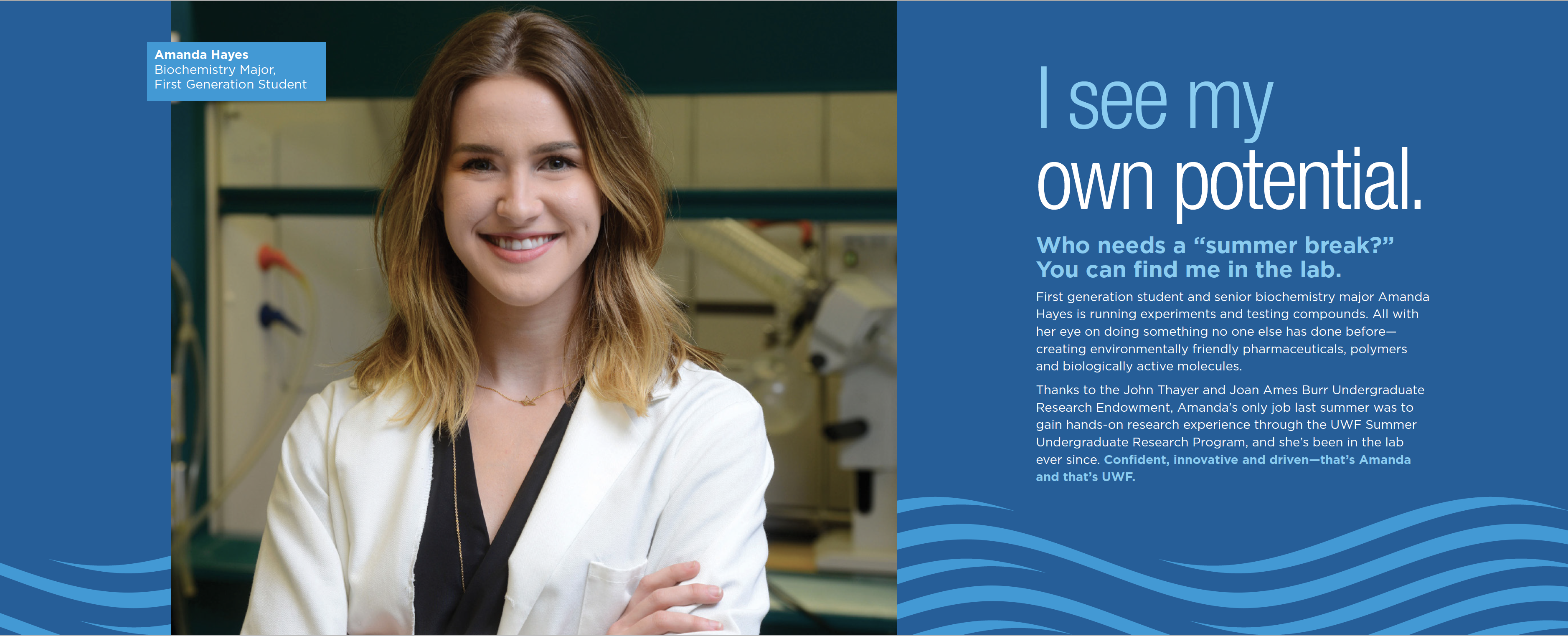 Who needs a “summer break?” You can find me in the lab. First generation student and senior biochemistry major Amanda Hayes is running experiments and testing compounds. All with her eye on doing something no one else has done before – creating environmentally friendly pharmaceuticals, polymers and biologically active molecules. Thanks to The John Thayer and Joan Ames Burr Undergraduate Research Endowment, Amanda’s only summer job was to gain hands-on research experience through the UWF Summer Undergraduate Research Program. Confident, innovative and driven – that’s Amanda and that’s UWF.