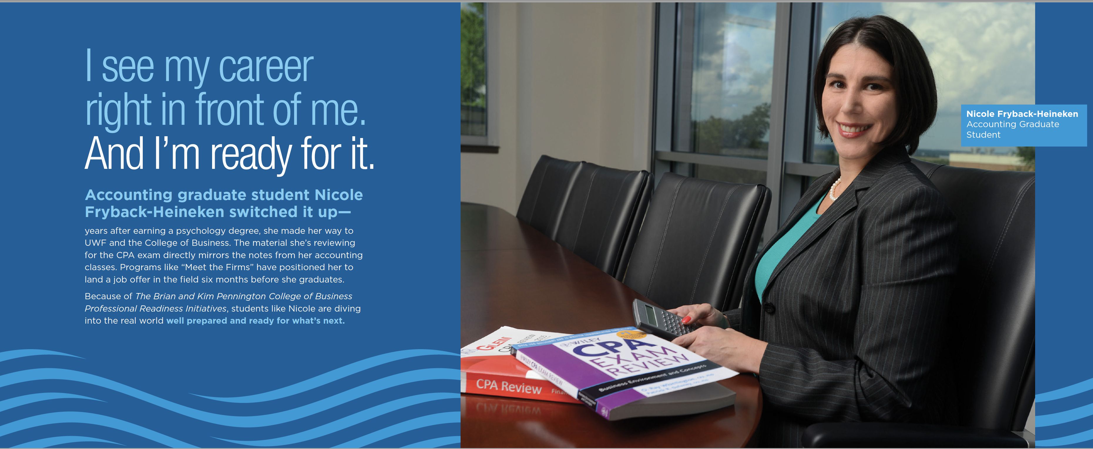 CPA exam: I got this. Accounting graduate student Nicole Fryback-Heineken switched it up – years after earning a psychology degree, she made her way to UWF and the College of Business. The material she’s reviewing for the CPA exam directly mirrors the notes from her accounting classes. Programs like “Meet the Firms” have positioned her to land a job offer in the field six months before she graduates. Because of The Brian and Kim Pennington College of Business Professional Readiness Initiatives, students are well-prepared, a step ahead and ready to get working.